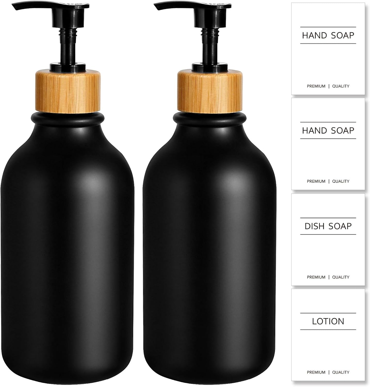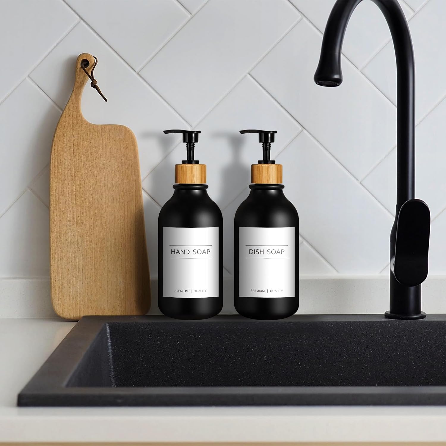 Introducing the sleek and versatile Hand Soap Dispenser Bathroom and Black Dish Soap Dispenser Set! Elevate your kitchen and bathroom decor with this stylish 2-pack refillable liquid lotion dispenser bottle set, complete with a bamboo pump for a touch of eco-friendly charm.